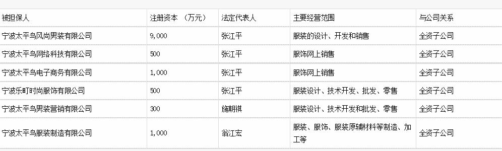 公告顯示被擔保人分別為寧波太平鳥風尚男裝有限公司、寧波太平鳥網絡科技有限公司、寧波太平鳥電子商務有限公司、寧波樂町時尚服飾有限公司、寧波太平鳥男裝營銷有限公司、寧波太平鳥服裝制造有限公司等。